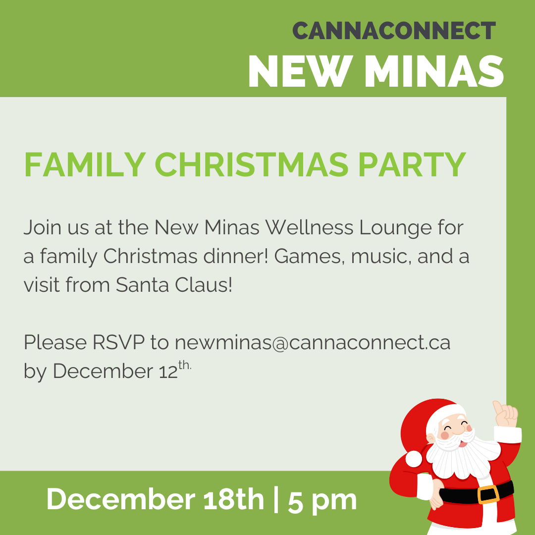 Join us at the New Minas Wellness Lounge for a family Christmas dinner! Games, music, and a visit from Santa Claus! Please RSVP to newminas@cannaconnect.ca by December 12th.