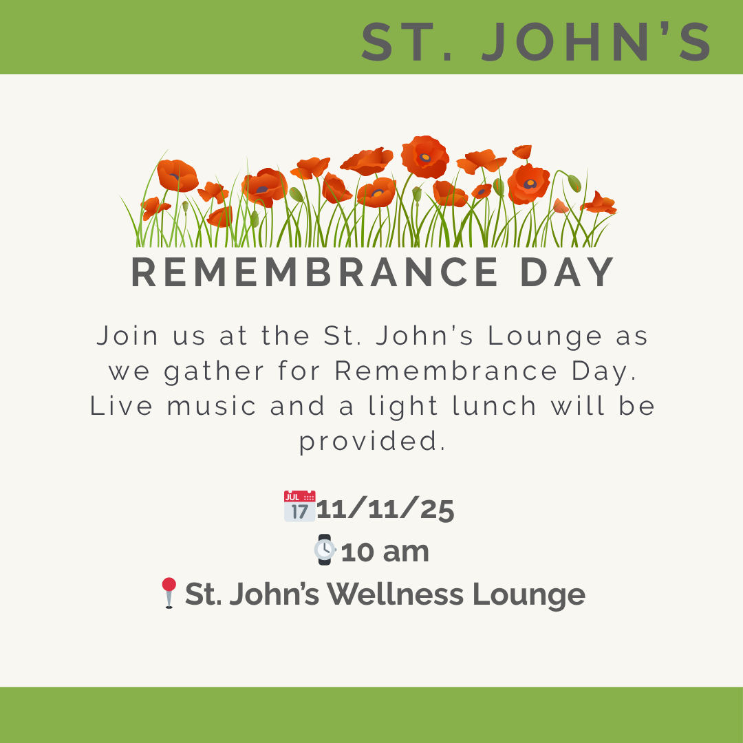 Join us at the St. John’s Lounge as we gather for Remembrance Day. Live music and a light lunch will be provided.